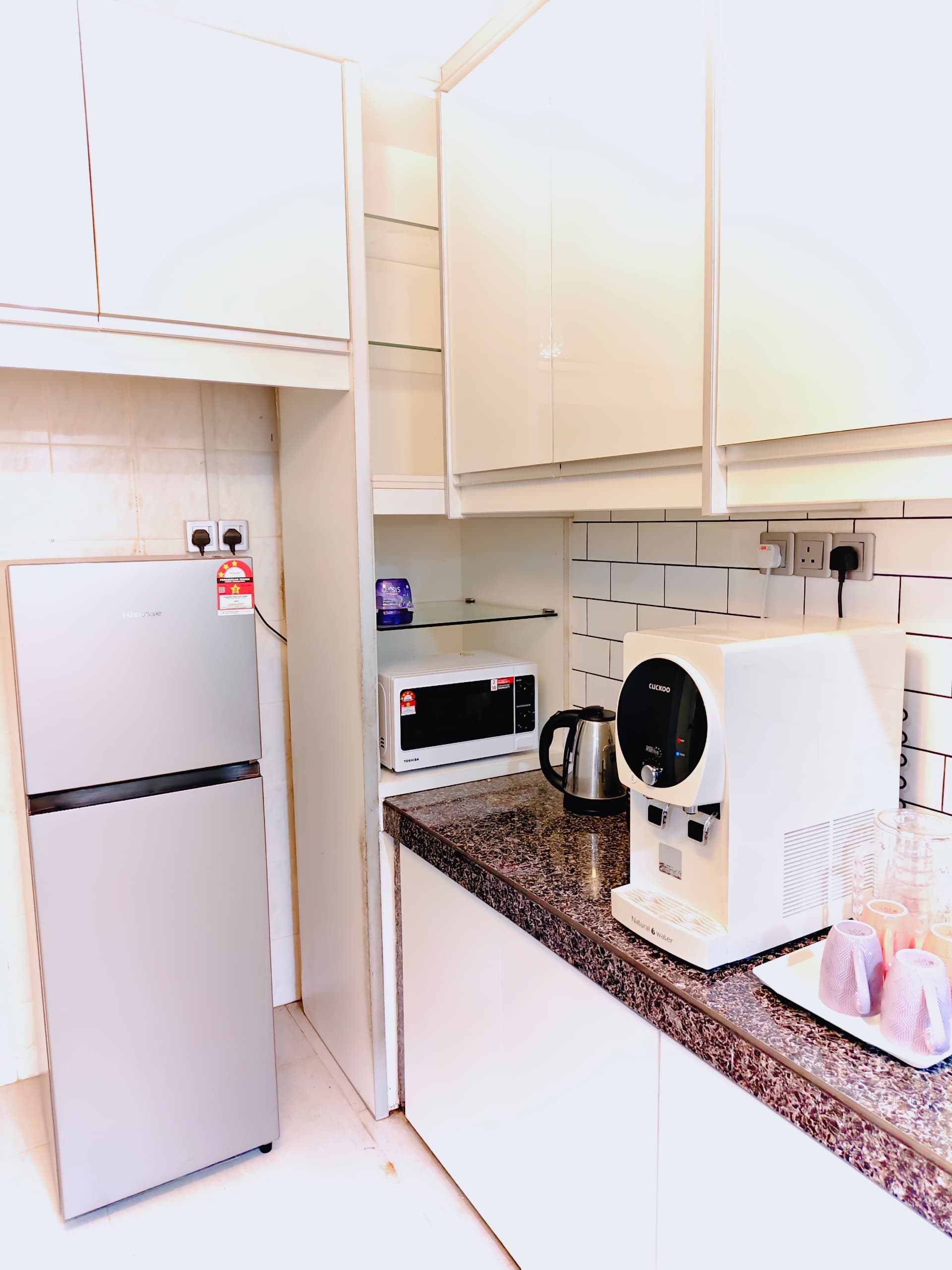 Penapis air Cuckoo, microwave, periuk nasi, electric jug kettle, pembakar roti dan dapur memasak.